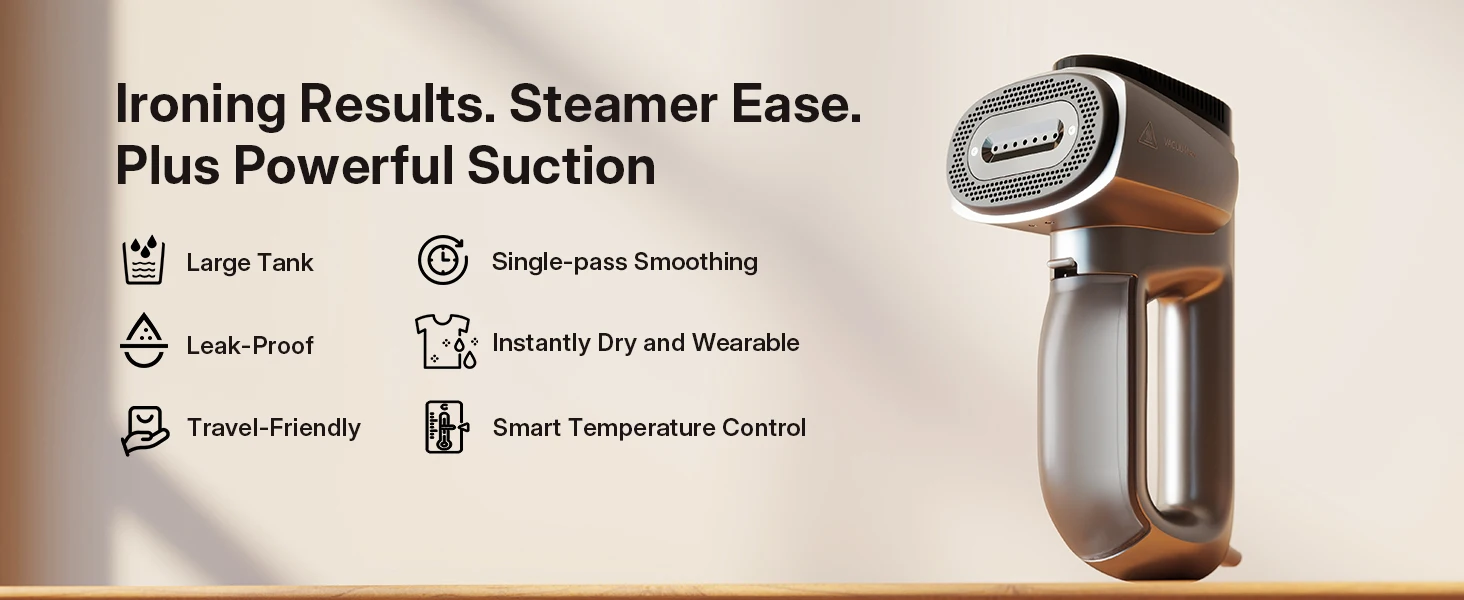 Neakasa's Airlron Technology maximizes steam efficiency by deeply penetrating fabrics and quickly suctioning the steam back, effectively doubling performance. As steam is drawn back, cool air rapidly cools and shapes the fabric. With a fast 30-second heat-up time,you can start steaming and ironing right away. This allows our steamer to handle three garments in the same time traditional steamers take for just one.